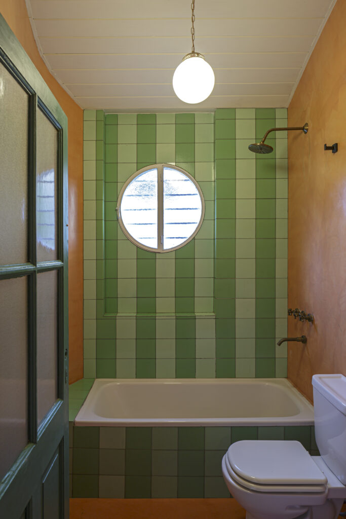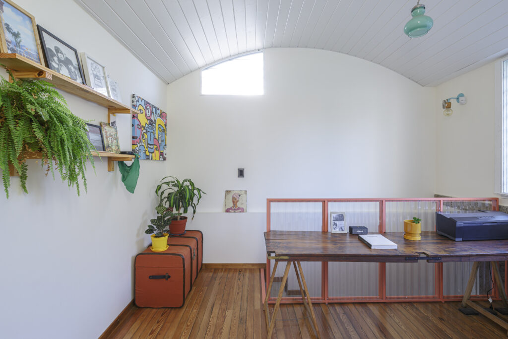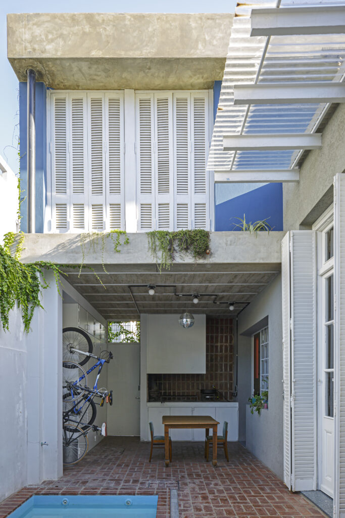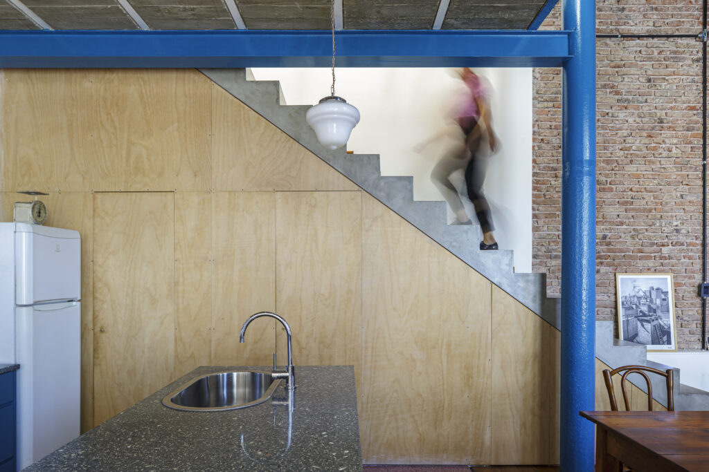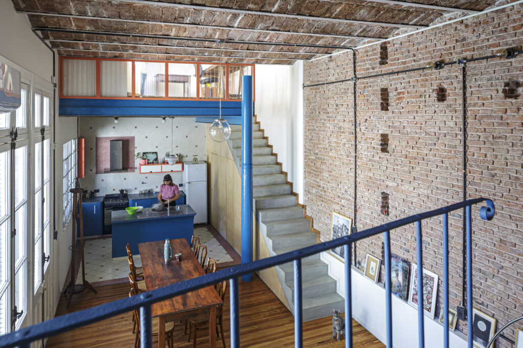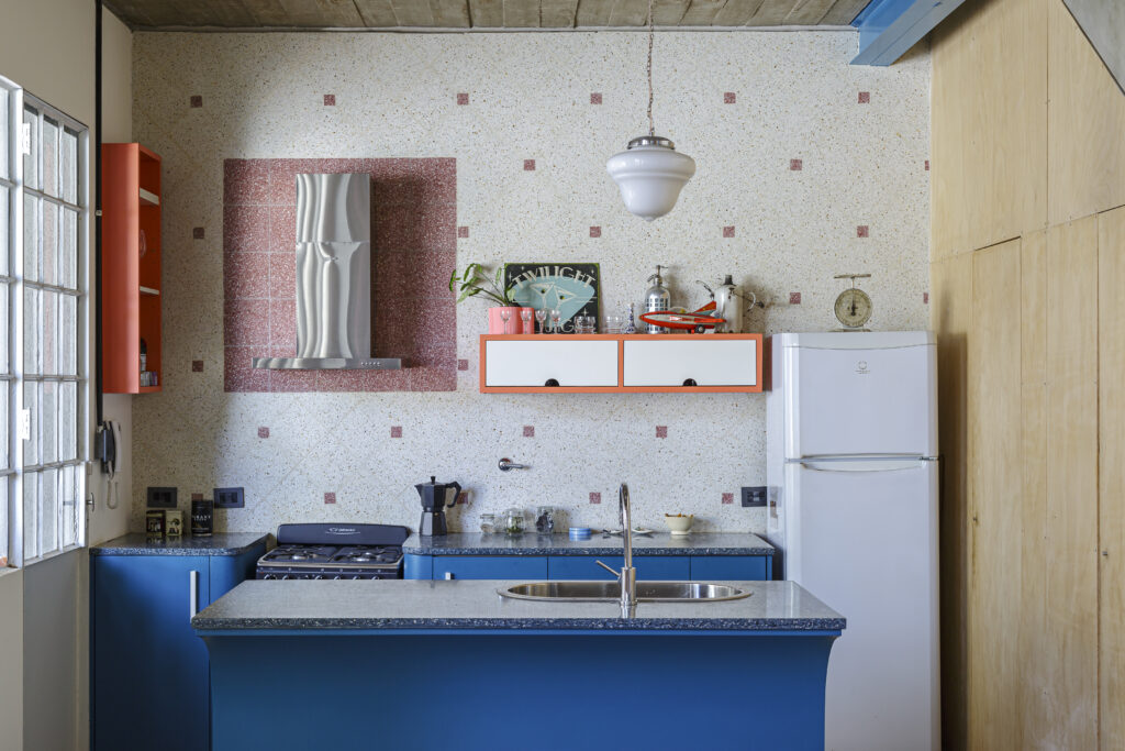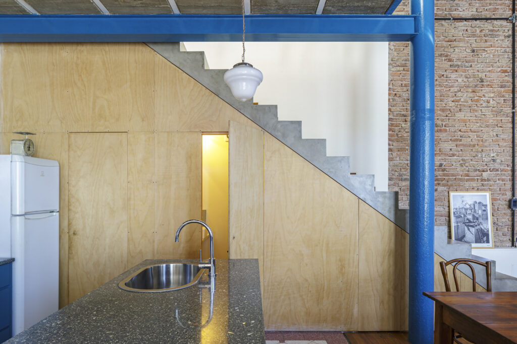 Los elementos nuevos de la obra también se reutilizan y resignifican: las maderas y los puntales del encofrado de la losa de hormigón se transformaron en la biblioteca del entrepiso. Así, tanto el dibujo del hormigón como la biblioteca y los tirantes del entrepiso copian el mismo ritmo de 63cm de la bovedilla original. En la cocina, los mosaicos graníticos que dibujan una alfombra en el piso suben por la pared y arman su propia composición junto con los muebles y electrodomésticos. La cocina de Casa Piragua rebalsa de colores e invade el comedor con una columna azul hecha de caños petroleros que, sin llegar hasta el techo, sostiene la planta alta.