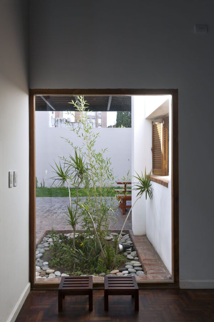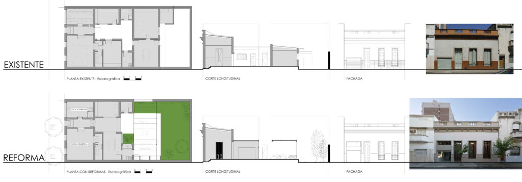La refuncionalización de los espacios buscó dar respuesta a un programa mixto: dos locales comerciales sobre la fachada a la calle, y hacia atrás, un sector de quincho y patio verde como pulmón de ocio.